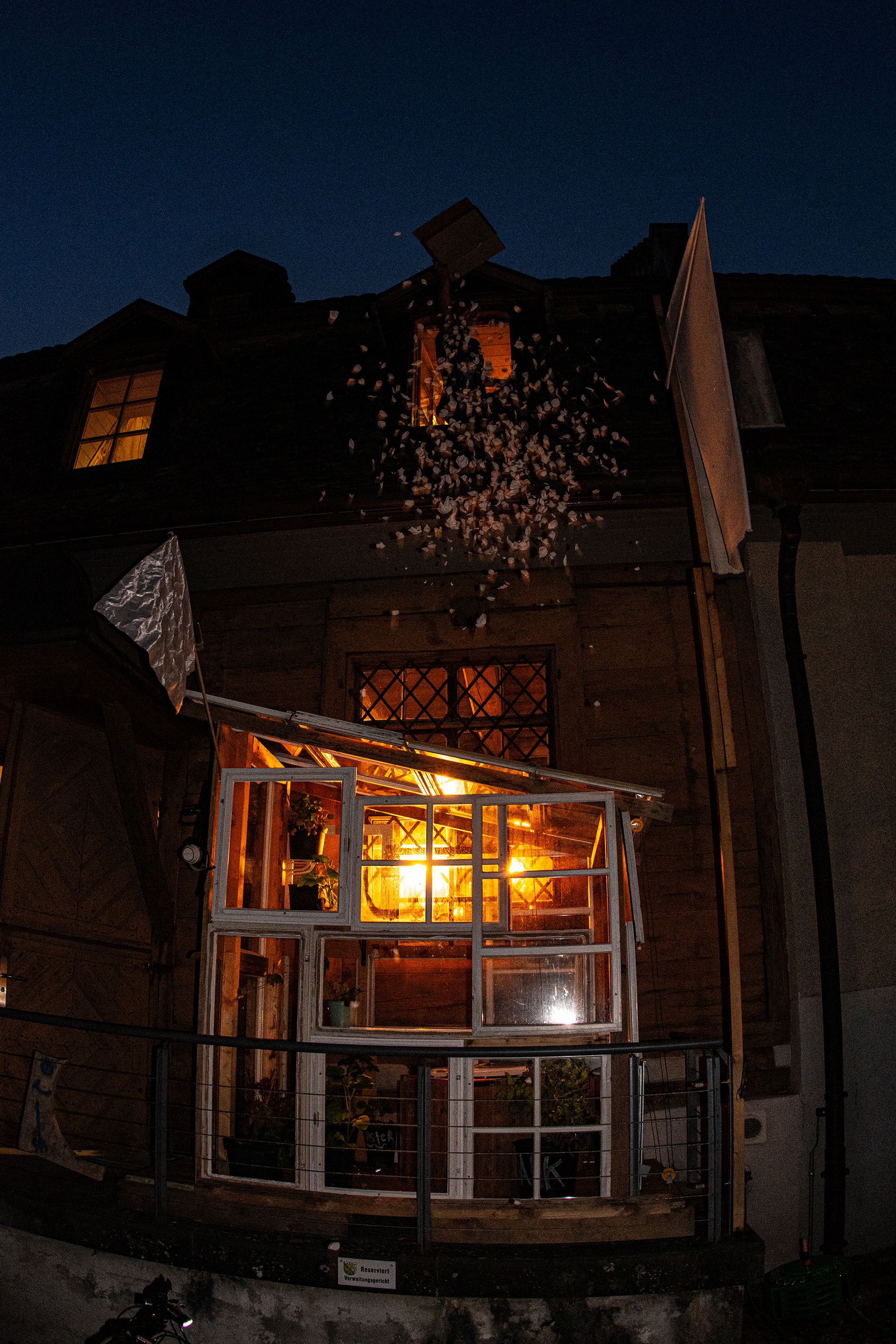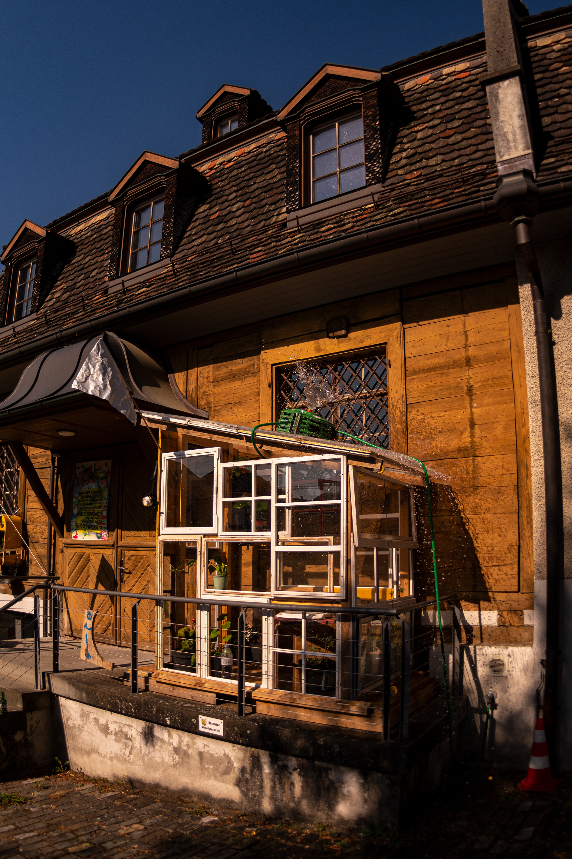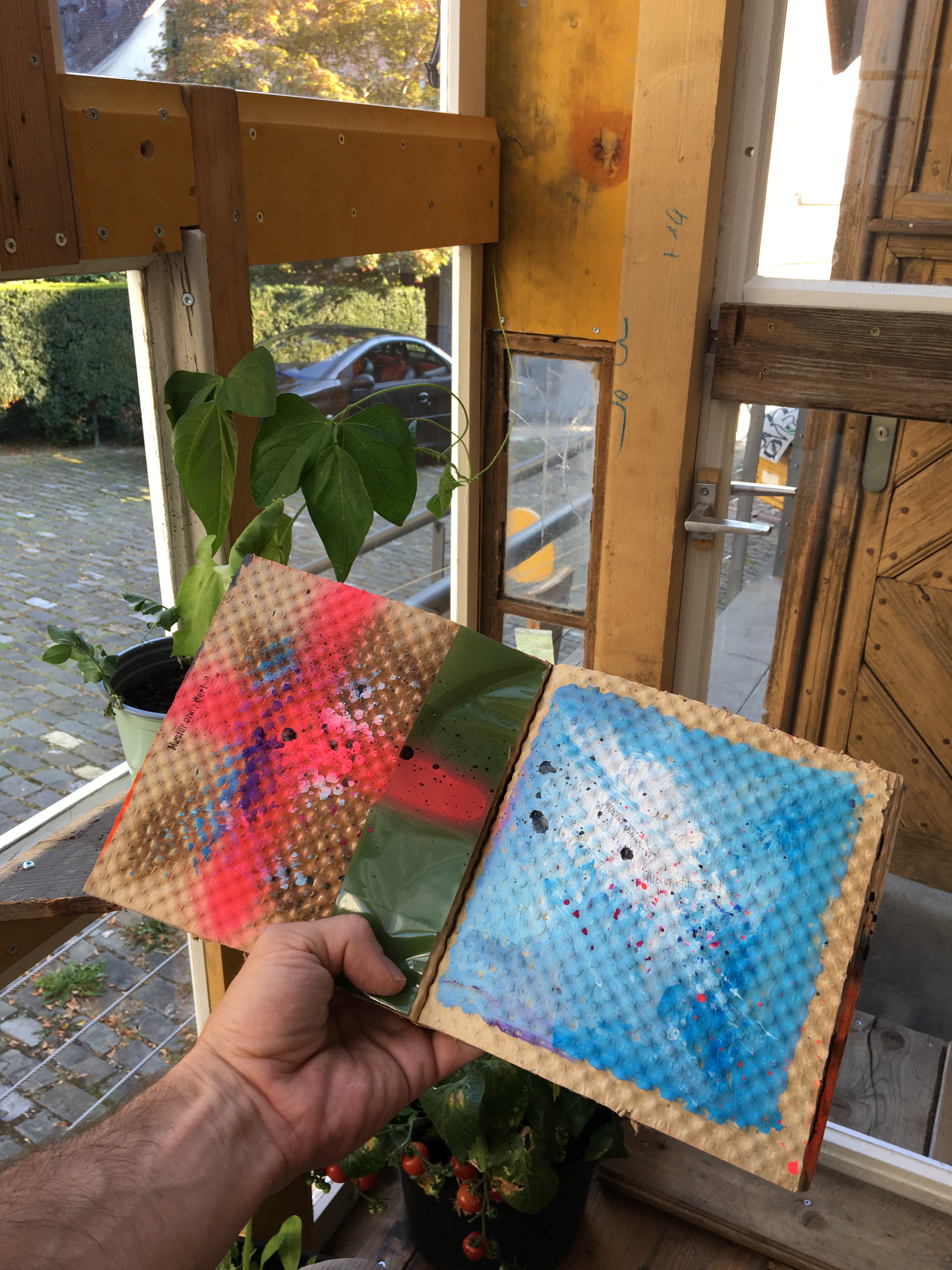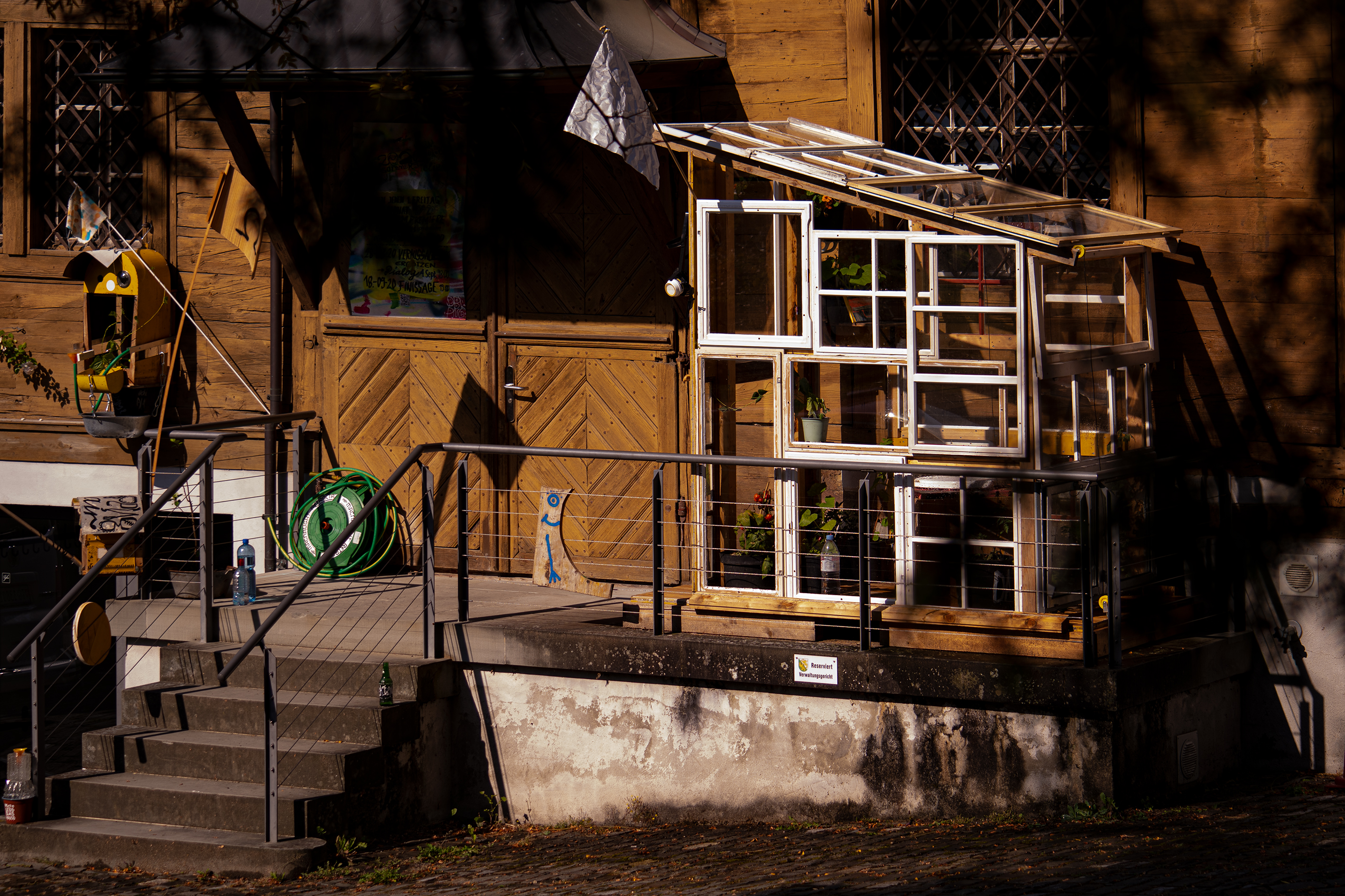 Man setzt sich in das kleine Glashaus. Es ist aus alten Fenstern und Balken zusammen gebaut. Drinnen wachsen Tomaten, Chili und andere Pflanzen wir Kräuter oder Blumen. An den Wänden hängen Malereien und Zeichnungen, oder es liegen kleine Fanzines von Kunstschaffenden für eine Bestimmte Zeit auf einem Tablar.