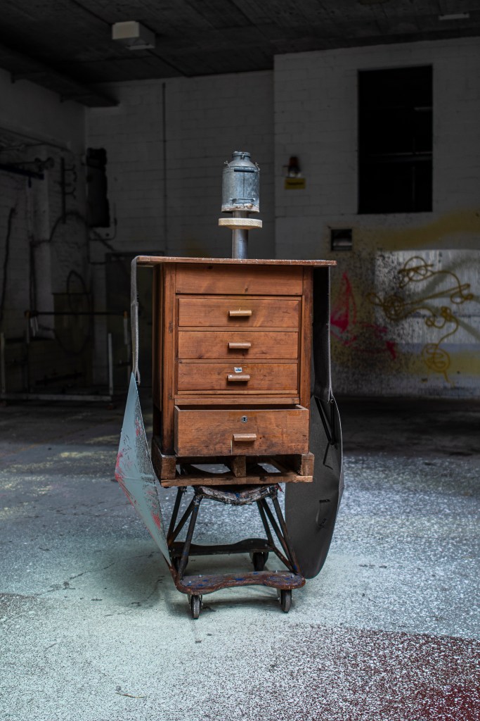Die Kunstobjekte „War Bot Defense“ von #dblpng Dynamics sind ein faszinierendes Beispiel für die Verbindung von Maschinen und Ästhetik. Die drei Werke „Blocker“, „Secure“ und „Spy“ bestehen aus einer Zusammenstellung von verschiedenen Materialien wie Metall-Ölkannen, grossen Tischen, Werkschränken, Schildern und anderen Objekten.
